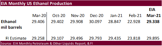 - EIA reported a slightly lower March US ethanol production versus our working March estimate.