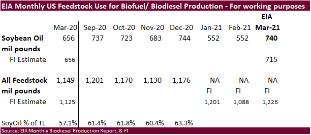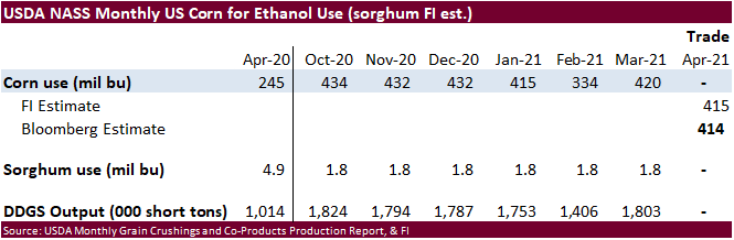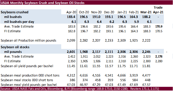 - A Reuters poll calls for the April US soybean crush to be reported at 171.1 million bushels (170.0-173.0 range), down from 188.2 million bushels in March and below 183.4 million in April 2020. US soybean oil stocks as of April 30 were estimated at 2.171 billion pounds (2.150-2.200 range), down from 2.245 billion at the end of March and 2.602 billion at the end of April 2020. Below table uses Bloomberg estimates with Reuters averages in the footnotes.