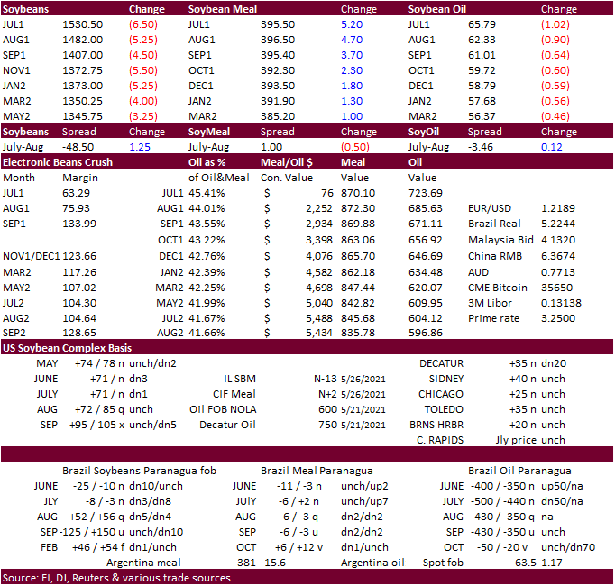 - Soybeans ended 6.5 cents lower at $15.3050 per bushel and new-crop November 5.50 lower at $13.7275. July soybean meal was up $5.20 at $395.50 a ton and CBOT July soyoil dropped 102 points to 65.79. CBOT soybean complex turned lower during the late overnight session after gold broke, but a general recovering in selected outside commodities, omitting energies, left some traders in limbo for the soybean complex. Ultimately prices appeared to have reacted to long liquidation in soybeans and soybeans oil, and a correction in oil share supported soybean meal that was already under pressure earlier in the week.