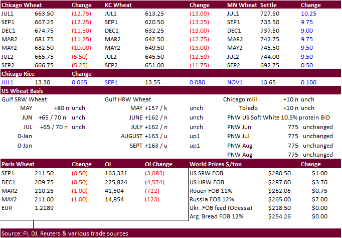 - Chicago and KC wheat was mostly lower in a pre-holiday trade positioning and Russia officials announcing a relaxation on their wheat export tax during a short period of June 2 through June 8 to $28.10 per ton from current $61/ton, based on their export tax formula. The southern Greta Plains will see rain over the next week. French wheat conditions improved from the previous week.
