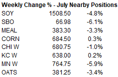 in a story said the U.S. EPA was considering ways to provide relief to U.S. oil refiners from biofuel blending mandates. RIN offers crashed after the early morning story broke. For the rest of Friday’s session, SBO led the markets lower, and meal found support