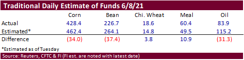 on Friday sold an estimated net 15,000 soybean contracts, bought 2,000 soybean meal and sold 25,000 soybean contracts.