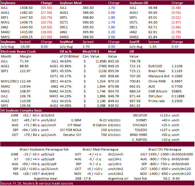 soybean complex was lower throughout much of the day but soybean meal ended higher on unwinding of oil/meal spreading. The bearish undertone was kicked off as prices trended lower following a drop in outside markets, improving Canadian canola weather, and