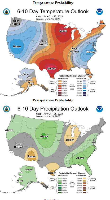 USD was down 79.6 points and WTI higher by $2.35/bbl. NOPA’s May crush for 95 percent of US processors was larger than expected, but they added a new member for the IA region. US soybean oil stocks came in well below expectations and that supported SBO futures. Soybeans, meal and grains also rallied on NA supply concerns. A drier US forecast supported prices today. The US CPC has a grim outlook for summer North American weather (see weather headlines). After the release of the US weekly drought monitor, several comments/tweets are flying around, including one that stated Illinois alone during the April 1-June 10th period is driest on record since 1988, second driest since data going back to 1951. Class one degradation was most notable for MI, IL, IA, and parts of WI & MN.