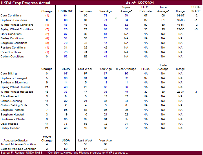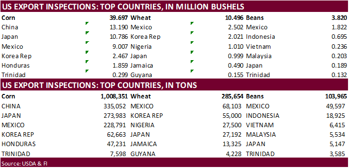 export inspections fell below expectations but an upward revision to last week and China taking a large amount of US corn was seen supportive. USDA US corn export inspections as of June 24, 2021 were 1,008,351 tons, below a range of trade expectations, below