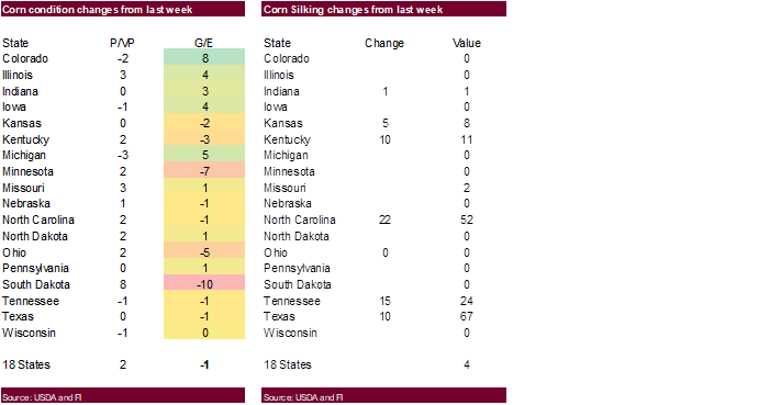corn conditions fell 1 point to 64 percent G/E. Traders were looking for a one point increase in crop conditions. We left out corn yield unchanged. 7-year average is 70.