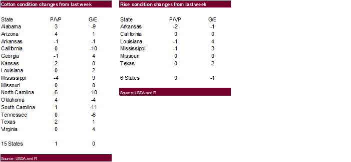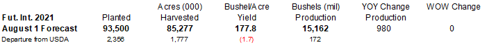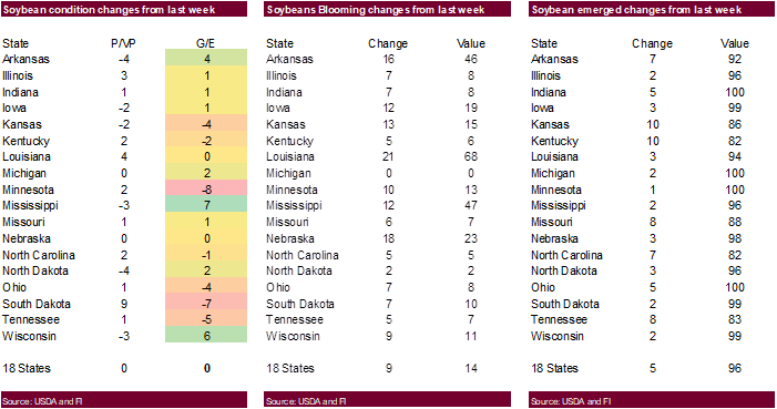soybean conditions were unchanged at 60 percent vs. 64 average. Traders were looking for a one point increase in crop conditions. We slightly lowered our US soybean yield.