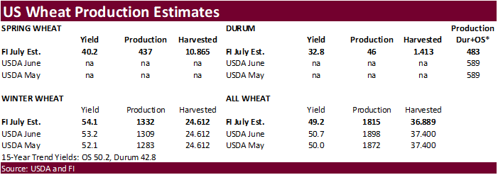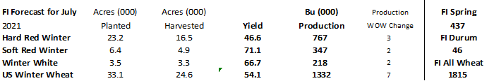 wheat conditions were down 1 point. Traders were looking for a one point increase in winter wheat crop conditions. See attached FI production estimates. Adjusting to our state by state crop progress, we actually raised winter production by s a slight amount