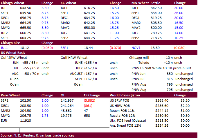 wheat futures were higher on spring crop wheat crop stress across the PNW to the upper Great Plains and Canadian Prairies, despite strong Russian wheat exports last week (500k) and Romania winning the Egypt GASC import tender. MN type wheat was today’s leader