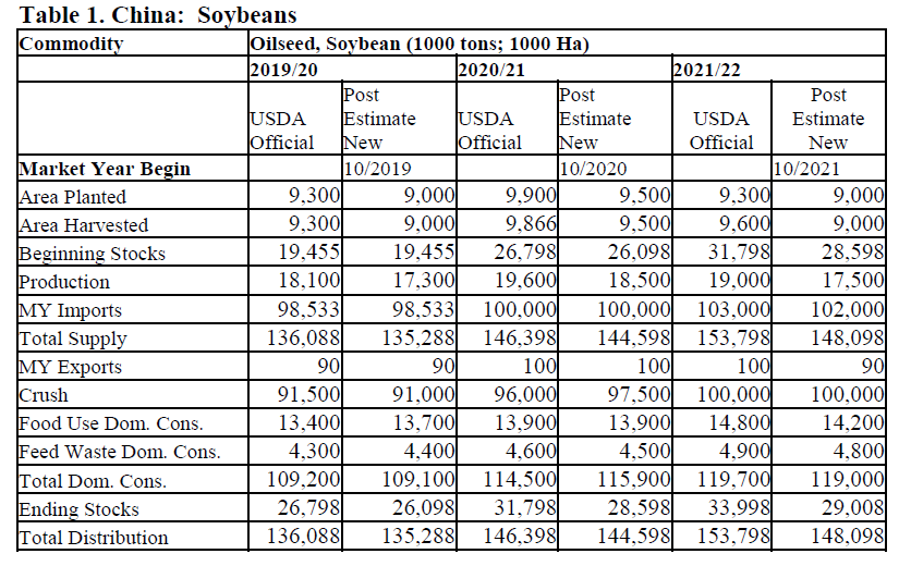 Attaché China oilseeds update – Soybean production down 1MMT Y-O-Y to 17.5, imports 102MMT versus 100MT this year