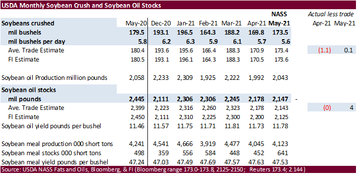 surprises other than very large soybean meal stocks at the end of May. Table below and graphs attached.
