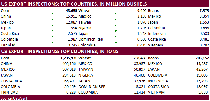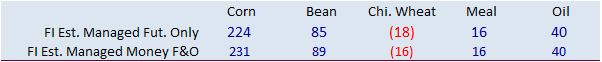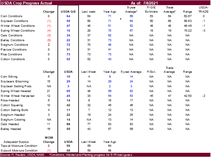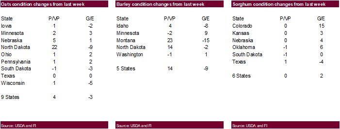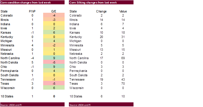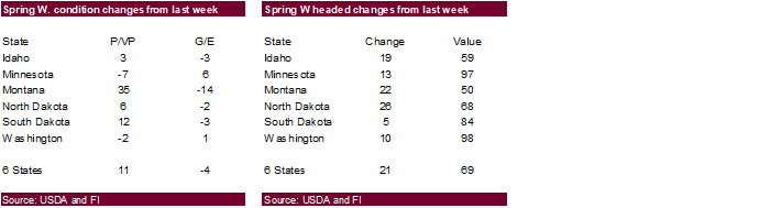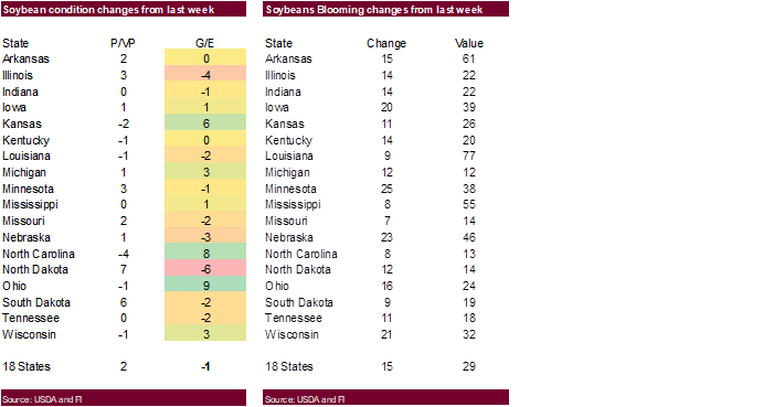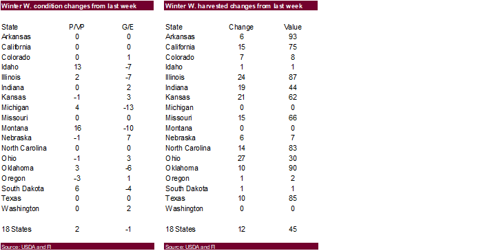 than expected drop in soybean, winter wheat and spring wheat conditions could provide a little support tonight but expect the trade to focus on upcoming rain events. We lowered our US soybean, corn and all-wheat yields. See attachments using updated USDA
