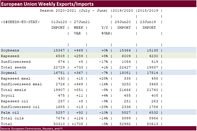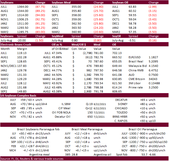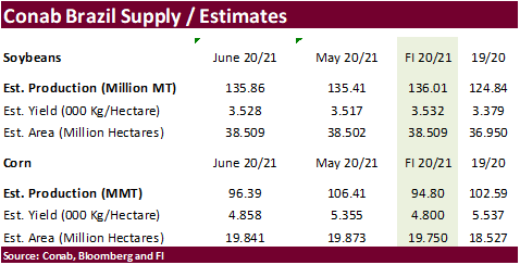 is due to update their S&D’s on July 12, but we look for minimal changes in the carryout. The 2020-21 US crush could be lowered 5 million bushels. We see no changes in the new-crop yield.