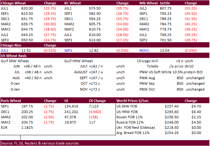 wheat traded lower on improving North American weather. Northern Great Plains saw much needed rain over the weekend and the weather outlook is wetter for the Northern Plains and Canadian Prairies than that of last week.