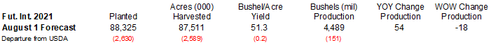 We lowered our US corn yield estimate by 1.0 bushel per acre, but still above USDA.