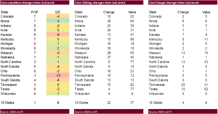 USDA US corn conditions were unchanged from the previous week in the combined G/E condition at 63 percent, one point above trade expectations.