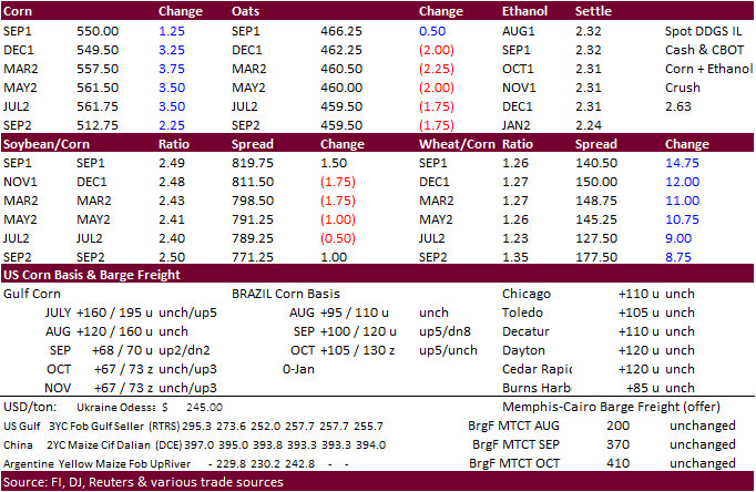 ended higher led by new-crop futures following strength in wheat and chatter China was inquiring about US corn. News was light. US ethanol production fell from the previous week and stocks increased. The September contract settled 0.50 cent higher and new-crop