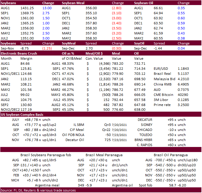 and soybean oil ended higher while meal ended lower. Good demand for domestic soybean oil help lift soybean oil higher. News was light. Traders are waiting for private US crop yield and production estimates, starting with private company surveys Friday