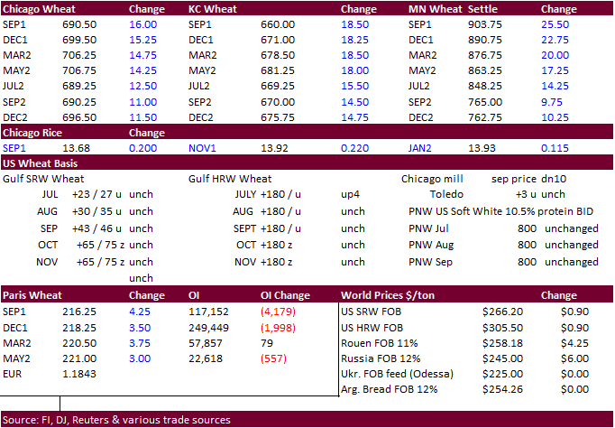 wheat ended sharply led by Minneapolis on North American supply concerns. Chicago snapped a four day losing streak. Day 2 early results of the Wheat Quality Council showed Hard red spring wheat yields across six fields in central North Dakota averaged 16