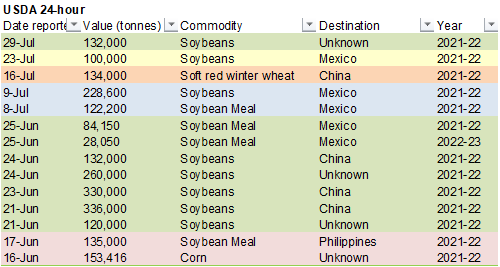 July 29, 2021–Private exporters reported to the U.S. Department of Agriculture export sales of 132,000 metric tons of soybeans for delivery to unknown destinations during the 2021/2022 marketing year.
