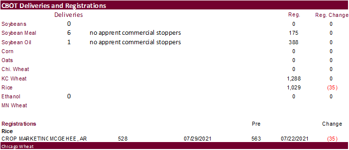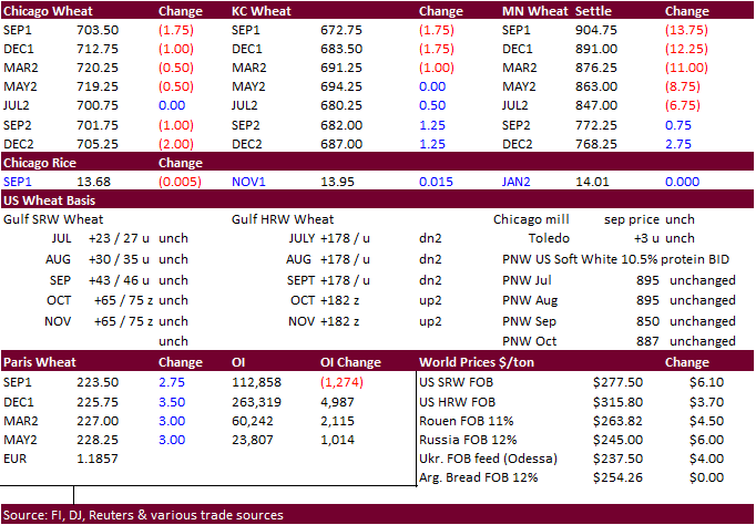 Wheat Associates: “The U.S. winter wheat harvest is rapidly progressing in northern and Pacific Northwest regions with warm, dry conditions holding on. HRW crop conditions remain variable. Harvest of a larger SRW crop is all but complete and all samples have
