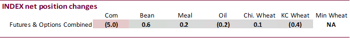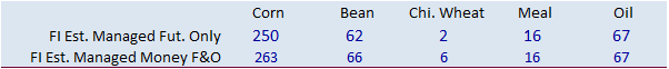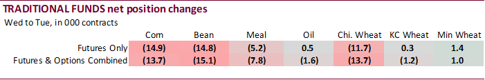 Funds sold an estimated net 12,000 soybeans, 4,000 meal and 4,000 soybean oil.