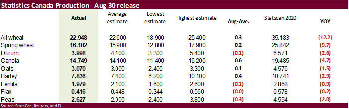 Stats Canada estimated the all-wheat crop at a 14-year low of 22.948 million tons. USDA is at 24 million tons for the all-wheat Canada production, down from 35.18 million tons for 2020 (last year same as StatsCan).