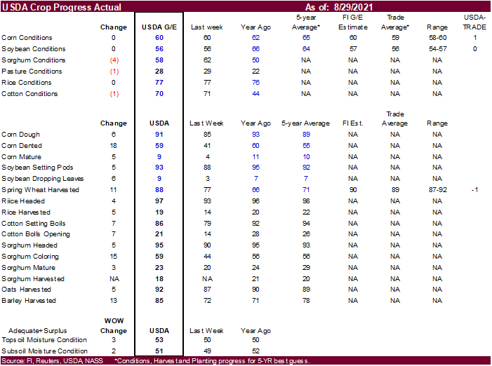 fielded several questions on Ida’s storm and grain export implications. Many USDA and private grain facilities that are located near or in the path of the hurricane in the Gulf states are closed and it may take at least one week for people to inspect and