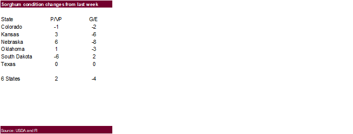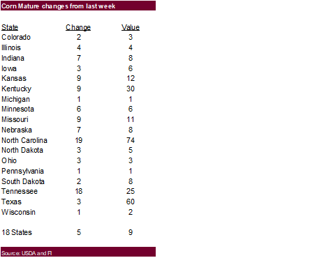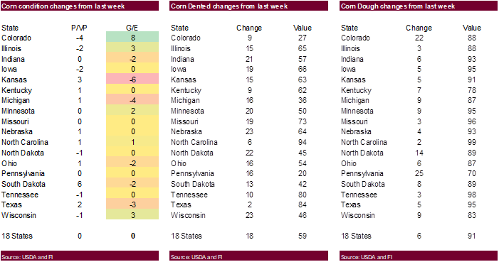 US corn conditions were unchanged but still below late August levels. We left production unchanged.