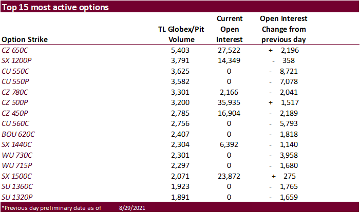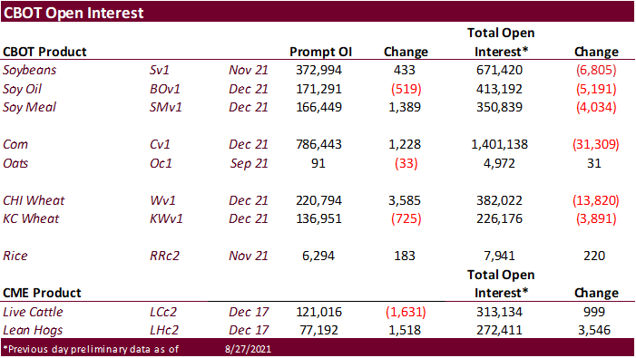 ag futures trade, including wheat despite an increase in global import demand (Egypt and Algeria). Hurricane Ida is disrupting US Gulf grain operations. Power outages/status should be heavily monitored. CBOT soybeans and corn nearby spreads collapsed today.