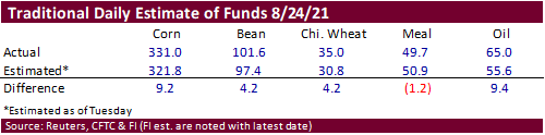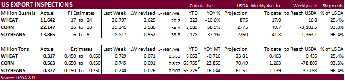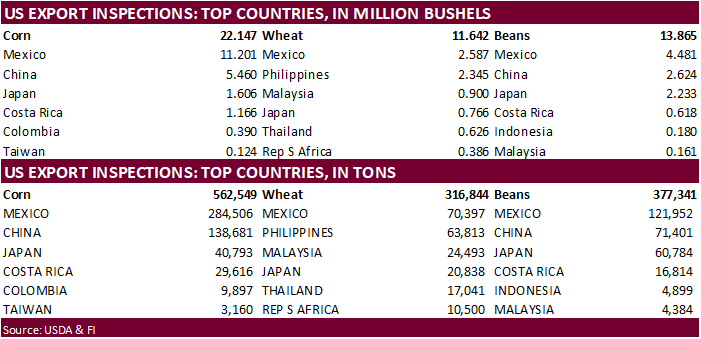 USDA export inspections were overall poor. US corn and soybean exports are expected to fall short of USDA’s projections for 2020-21. China demand for US soybeans needs to be monitored, in terms of commitments but more importantly shipments. Funds were heavy