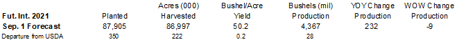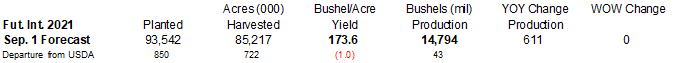 Allendale via Dow Jones: “The US corn crop is likely to reach 14.9B bushels and soybeans will amount to 4.3B bushels…based on its Nationwide Producer Yield Survey conducted from Aug. 16-27. The survey puts the 2021 corn yield