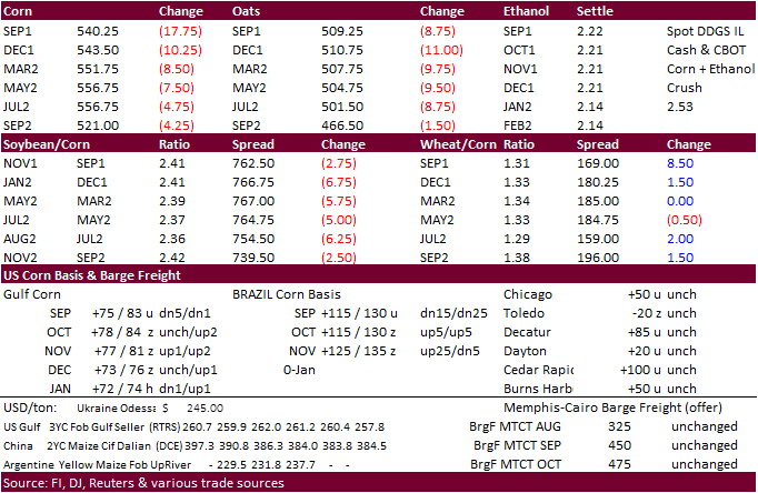 In a risk off session, CBOT corn futures traded lower led by the soon expiring September contract on favorable weekend weather and sharply lower soybeans along with poor export inspections. Funds sold an estimated net 16,000