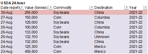 20.00 cents. Risk off was noted as the US Gulf storm Ida knocked off grain shipments/logistics. Slow US shipments over the past week (inspections expected to fall short of USDA’s crop-year projection) were also weighing on the Sep contract.