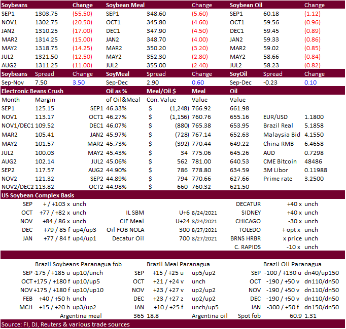 The CBOT soybean complex traded lower led by the collapsed in the nearby soybean September contract due to head into its scheduled delivery process on Tuesday. September soybeans were down 54.50 cents and new-crop November off