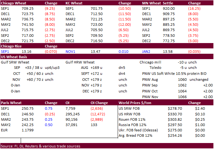 Wheat ended lower following steep losses in nearby soybeans and corn. MN wheat contracts continue to see harvest pressure. The Canadian all-wheat production estimate was reported near expectations. Chicago and KC were thought