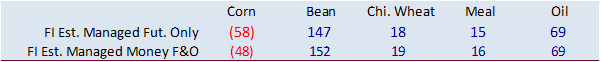 bought an estimated net 2,000 soybean contracts, bought 4,000 soy meal, and sold 4,000 soybean oil.