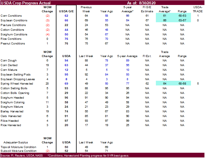 soybean conditions declined 3 points this week to 66 percent, as expected, and compares to 55 year ago and 64 percent average. Louisiana fell 28 points, Kansas was down 11, Nebraska down 5 and Iowa down 6. Soybeans dropping leaves were reported at 8 percent.
