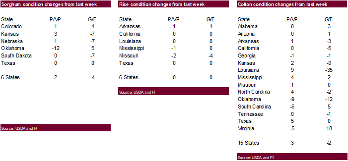 corn conditions declined by a less than expected 2 points (trade looking for 3) to 62 percent, compared to 58 percent year ago and 66 average. Colorado fell 8 points. Iowa and Kansas were down 5 points. Indiana fell 1 point and Illinois dropped 2 points.