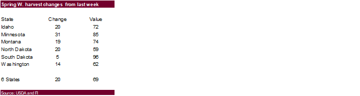 spring wheat harvesting progress advanced 20 points to 69 percent. This was 5 points above expectations and compares to 50 year ago and 77 average.