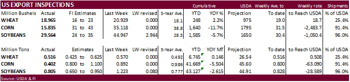 Malaysia was on holiday. Egypt seeks soybean oil and sunflower oil for November shipment. Algeria seeks 50,000 tons of wheat and it was confirmed Pakistan added 320,000 tons of wheat to their 1.5-million-ton import tender. South Korea’s MFG is in for 70,000