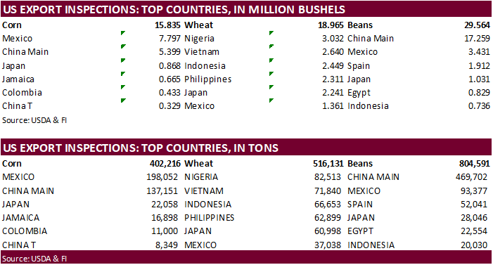 low US Gulf corn inspection loadings were likely a result from disruption from the two storms and closures ahead of the hurricane shifting over TX. We think the low corn inspections supported soybean/corn spreading.