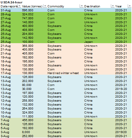 sales of 596,000 metric tons of corn for delivery to China during the 2020/2021 marketing year.