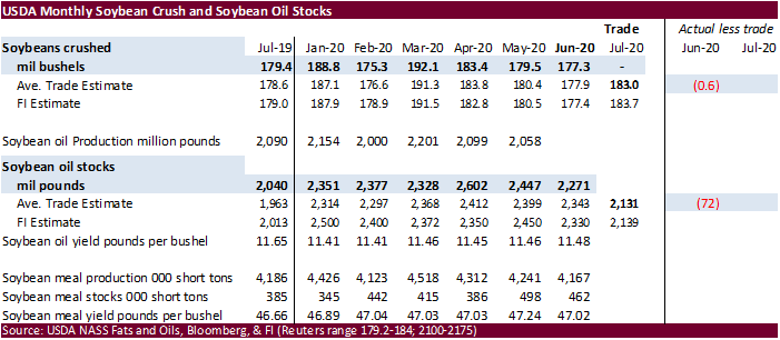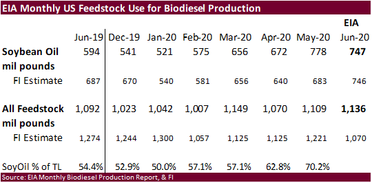 soybean oil for biodiesel production came in at our expectation, and we still look for use to end up 75 million pounds above USDA (see attached monthly soybean oil balance).