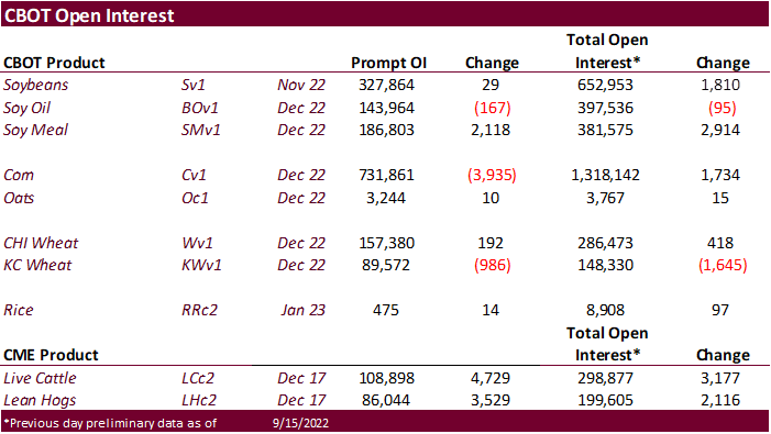 FI Evening Grain Comments 09/16/22 Sep 16, 2022 PDF Attached CFTC COT and funds will be sent out in a separate email. Soybeans and meal traded lower Friday in part to seasonal harvest pressure. Soybean oil was very strong from product spreading and tight US stocks reported yesterday by NOPA. Grain and meal basis was steady to lower. Wheat was higher on renewed Black Sea shipping and geopolitical concerns, which underpinned corn prices. Corn and Chicago wheat ended the week lower and the soybean complex appreciated.