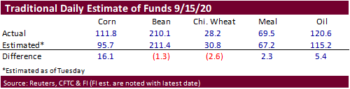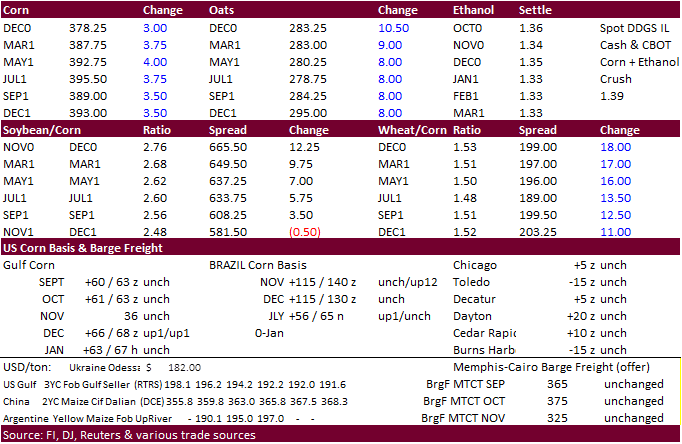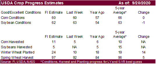 corn ratings declined to 59 percent good to very good as of September 14 from 60 percent previous week (year ago 59 percent). 4% of the corn crop had been collected.