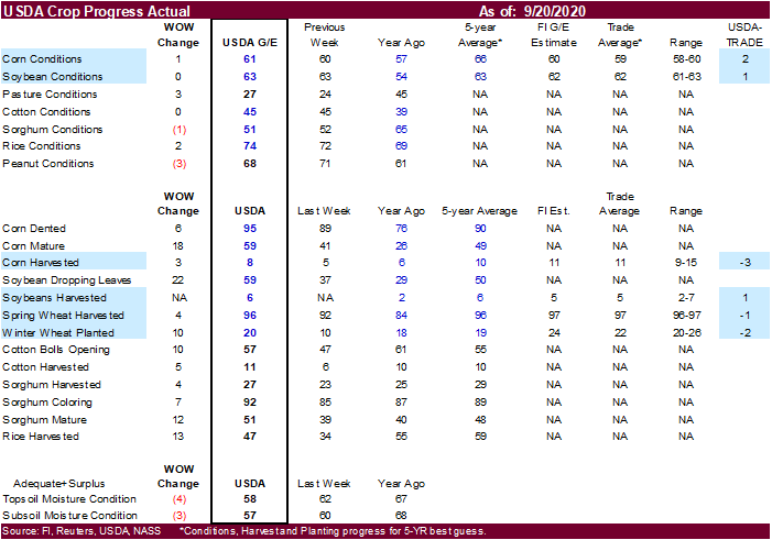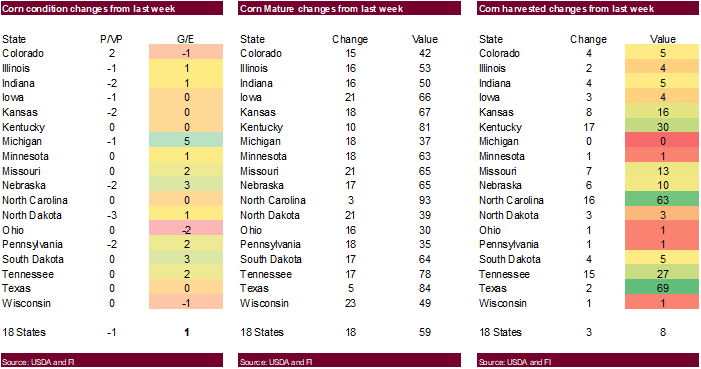 corn harvest progress was reported at 8 complete from 5 percent previous week, 6 year ago and compares to 10 percent average. The trade was looking for 11 percent. 95 percent of the crop was dented and 59 percent mature (49 average).