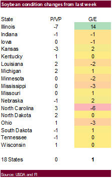 US corn and soybean conditions improved one point each, and both were one point above trade expectations. US corn harvest was 10% complete, up from 4% previous week and ahead of the five-year average of 9%. IA was 4% complete