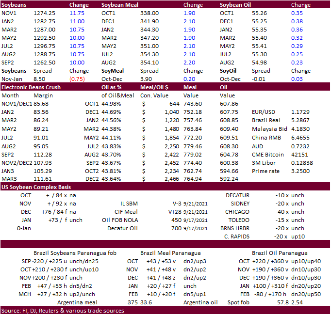 Soybeans, meal, and oil were higher led by soybeans that put pressure on CBOT crush values. November soybeans traded and settled above its 200-day MA of $12.6850. After a two-sided trade, soybean oil settled higher (bull spreading)