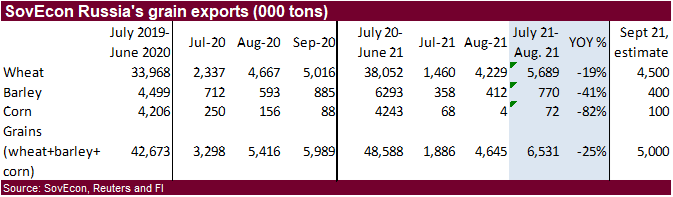 Kazakhstan estimated their 2021 grain production at 16 million tons, up from 15.3 million tons last month. Kazakhstan lowered their grain export projection for 2021-22 to 6.0-6.5 million tons from 6.0-6.7 million previous.